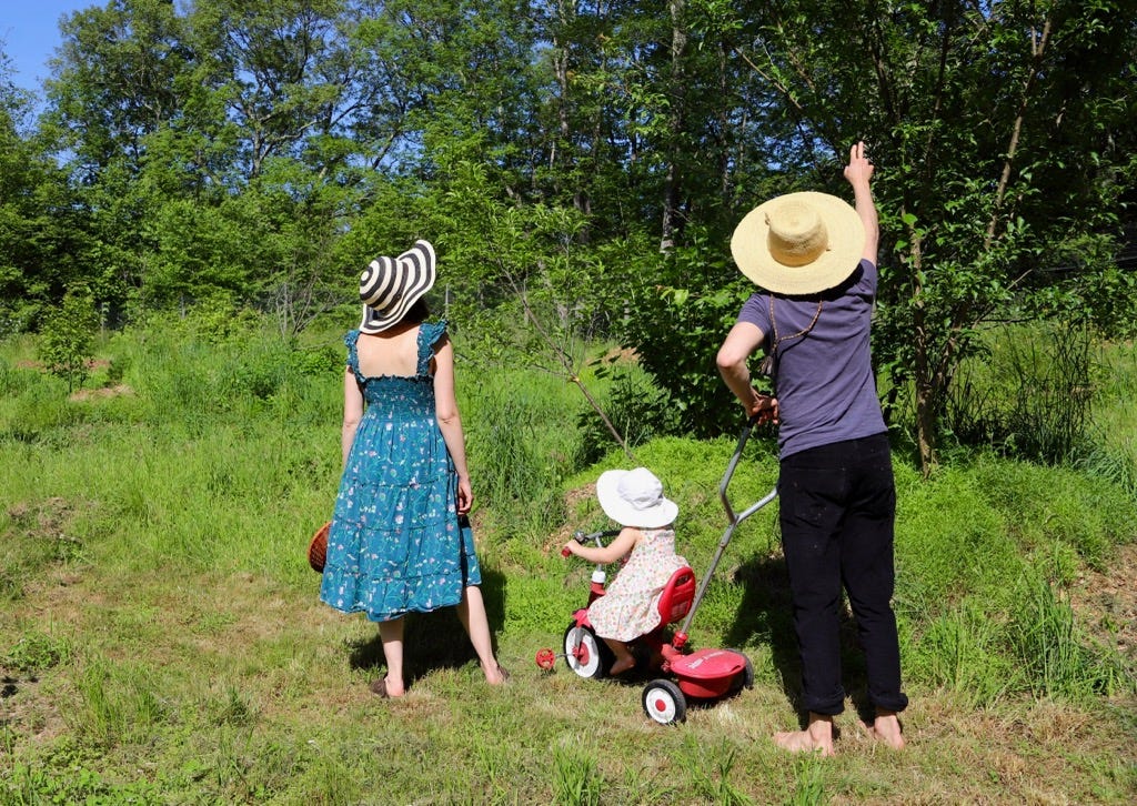 At home the garden is blooming tucked among beds of bluets, red clover, dandelions and other green neighbors I have yet to learn the names of. My husband and daughter kneel into the soil and tenderly pull peeking red radishes up from the earth. When they return, she shows me her harvest and bites into the spicy root. Then lifts it up towards me. Smiling proud.